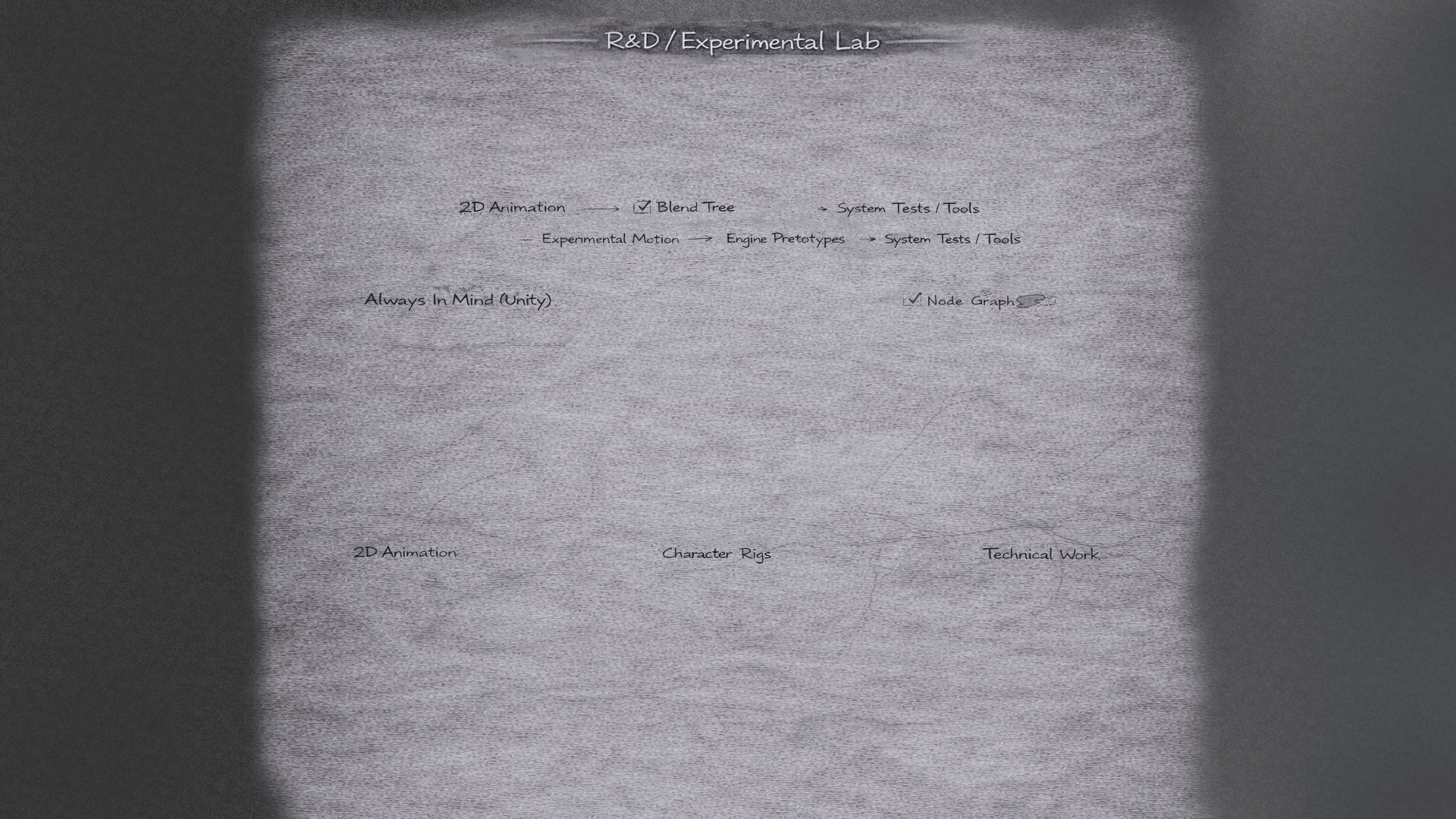 My R&D practice keeps leadership grounded in craft. Through hands-on experiments in rigging, engine implementation, runtime systems, and motion prototyping, I continuously explore how animation can be more responsive, scalable, and technically elegant. The Lab is not side work — it is an evolving sandbox where I test ideas, refine tools, and deepen cross-disciplinary fluency. It ensures that my direction remains informed by execution, not abstraction.